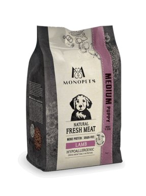 Monopets hypoallergeen Fresh Meat Medium Puppy Lam is een smaakvol graanvrij hondenvoer op basis van één dierlijke eiwitbron. Deze natuurlijke voeding bevat zorgvuldig geselecteerde ingrediënten om het risico van allergische reacties tot een minimum te beperken. Het product is gemaakt zonder granen en zit boordevol groenten en fruit, zoals zoete aardappel en appel. Waardevolle vezels uit prebiotica en natuurlijke bronnen ondersteunen de gezondheid van de darmen, en essentiële vetzuren zorgen voor een glanzende vacht en gezonde huid.