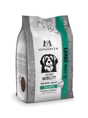Monopets hypoallergenic Large Vet-Diet Mobility Zalm: Inzet van verse zalm als licht verteerbare en hoogwaardige eiwitbron met een hoog gehalte aan omega-3 vetzuren. Daarnaast is het verrijkt met extra omega-3 en een verhoogd gehalte aan vitamine E ter ondersteuning van de gewrichten bij osteoartritis.